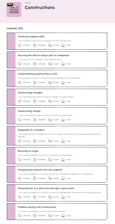 We first start by exploring compass skills, before building to the construction of a circle, triangles, rhombi and rhombus. Finally, for lesson 10, pupils should be able to problem-solve with constructions.