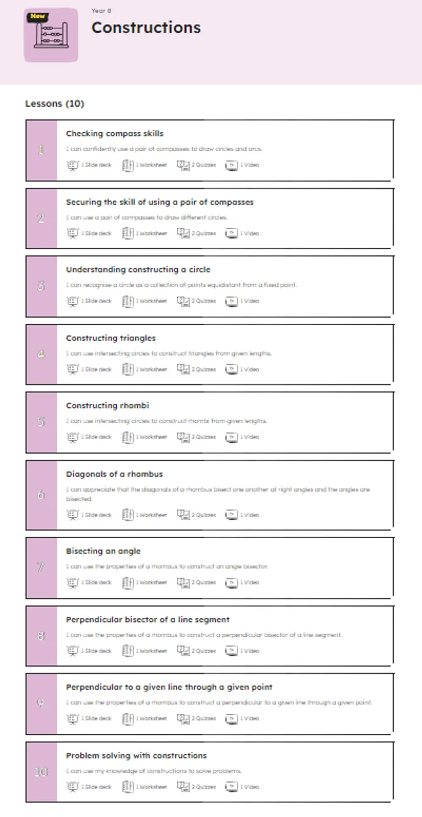 For example, if we look at the popular key stage 3 unit of Constructions, we’ve created teaching resources that could be used to plan 10 sequenced lessons. The resources first introduce compass use, before building on this knowledge.