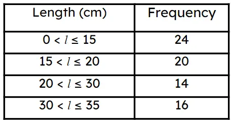 Q4.Here is some data on the lengths of some string. Which class interval shows a frequency density of 1.4?