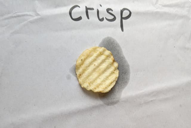 Paper, foods containing different amounts of fat such as a tomato, cheese, chocolate spread, crisps, bread and a sausage. Check for any allergies and adjust foods to be used accordingly.